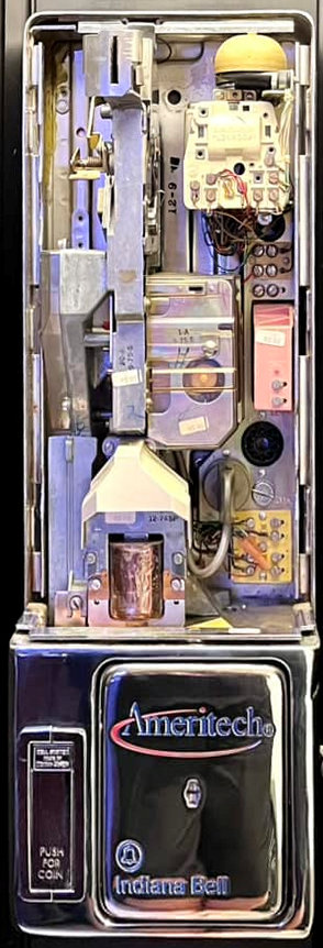 1C2 payphone, 1975, 31A board and 20A coin sorter. Mechanical totalizer visible in the middle.